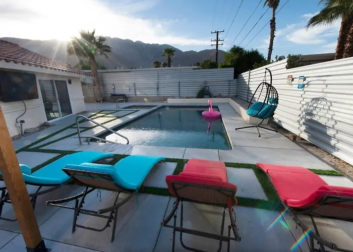 Saltwater Pool And Mountain Views Villa Palm Springs offers swift access to various city sites, such as the San Andreas Fault, situated about a 5-minute walk away.